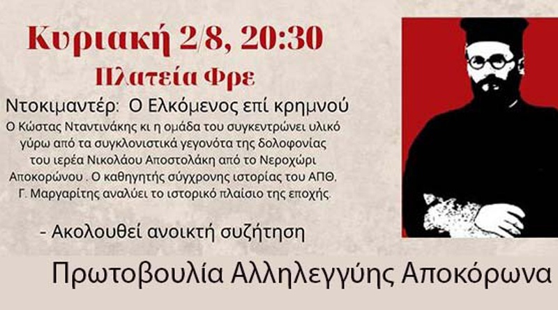 Η Πρωτοβουλία Αλληλεγγύης Αποκόρωνα διοργανώνει την προβολή του ντοκιμαντέρ του Κώστα Νταντινάκη «Ο Ελκόμενος επί κρημνού» στην πλατεία του Φρέ Αποκορώνου, την Κυριακή 2 Αυγούστου στις 20:30.