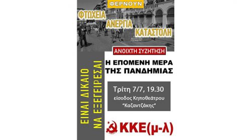 Η Κ.Ο. Ηρακλείου του ΚΚΕ(μ-λ) καλεί σε ανοιχτή συζήτηση με θέμα “Η επόμενη μέρα της πανδημίας” την Τρίτη 7/7 και ώρα 19:30 στην είσοδο του κηποθεάτρου Ν. Καζαντζάκης. Είναι δίκαιο να εξεγείρεσαι!Αντίσταση στην “κανονικότητα” του εργασιακού μεσαίωνα, της λιτότητας, της καταστολής, του πολέμου, της προσφυγίάς.Ο ΛΑΟΣ ΣΤΗΝ ΠΡΩΤΗ ΓΡΑΜΜΗ!ΕΝΑΝΤΙΑ σε κυβέρνηση, κεφάλαιο, ιμπεριαλισμόΓΙΑ ειρήνη, δουλειά, ελευθερίες, ανεξαρτησία