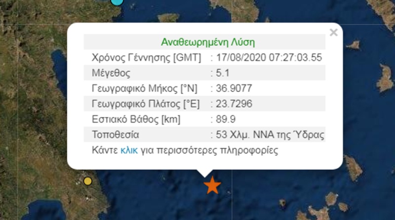Σεισμική δόνηση των 5,1 Ρίχτερ σημειώθηκε πριν από λίγο και συγκεκριμένα στις 10.27, 53 Χλμ. ΝΝΑ της Ύδρας.
