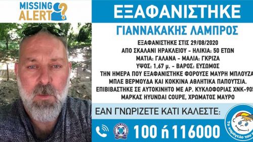 Στις 29/8/2020 αργά το βράδυ, εξαφανίστηκε από το χωριό Σκαλάνι Ηρακλείου, ο Λάμπρος Γιαννακάκης, 50 ετών. Το «Χαμόγελο του Παιδιού» ενημερώθηκε για την εξαφάνιση του Λάμπρου Γιαννακάκη, στις 02/9/2020 και προχώρησε στη δημοσιοποίηση των στοιχείων του ενήλικου κατόπιν αιτήματος συγγενών του, καθώς ενδέχεται να συντρέχουν λόγοι οι οποίοι θέτουν τη ζωή του σε κίνδυνο. Ο Λάμπρος έχει ύψος 1,67 μ., είναι εύσωμος,…