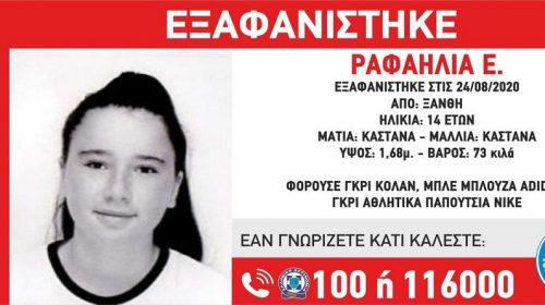 Συναγερμός έχει σημάνει στο Χαμόγελο του Παιδιού για την εξαφάνιση της 14χρονης Ραφαηλίας Ε. η οποία εξαφανίστηκε στις 24 Αυγούστου και ώρα 15.50 από την περιοχή της Ξάνθης όπου βρίσκεται το σπίτι της. Η Ραφαηλία Ε. έχει ύψος 1,68 μ., 73 κιλά βάρος, καστανά μαλλιά και καστανά μάτια. Την ημέρα που εξαφανίστηκε φορούσε γκρι κολάν, μια μπλε μπλούζα με την επωνυμία…