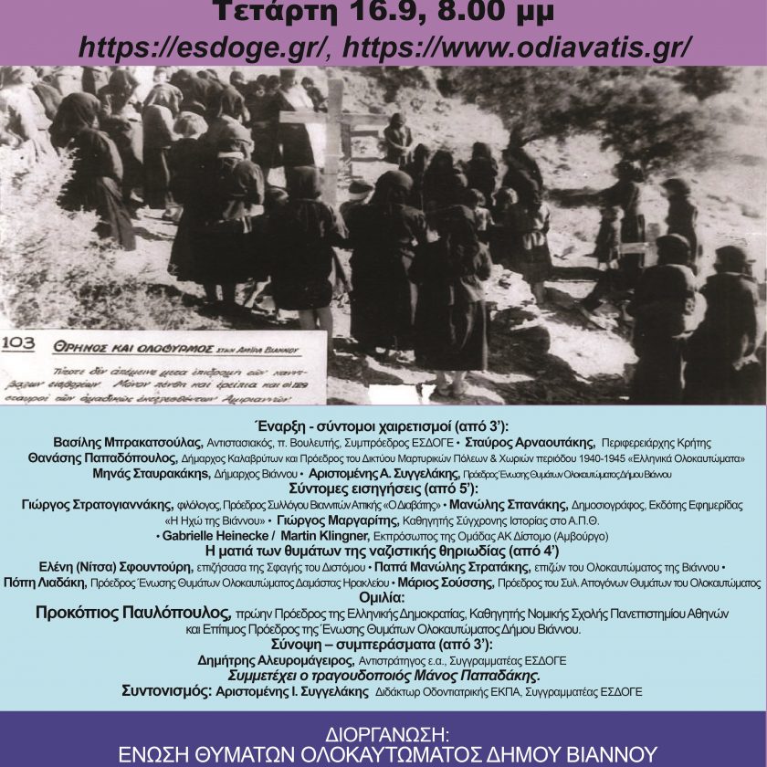 Με βάση τα παραπάνω και θέλοντας να αποδώσουμε τη δέουσα τιμή στα θύματα του Ολοκαυτώματος της Βιάννου και συνολικά στα θύματα της ναζιστικής θηριωδίας στην Ελλάδα οργανώνουμε διαδικτυακή εκδήλωση – συζήτηση με τίτλο: «Το Ολοκαύτωμα της Βιάννου και ο ανυποχώρητος αγώνας για Δικαιοσύνη και Αποζημίωση» με τη συμμετοχή εξαιρετικά σημαντικών ομιλητών.