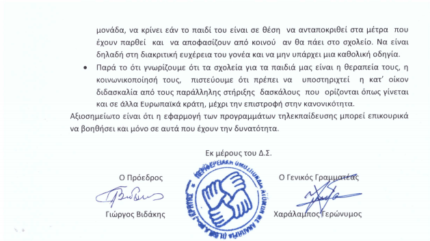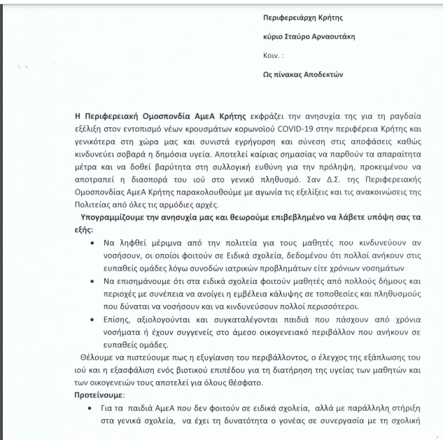 Μεταξύ άλλων, κρίνεται επιβεβλημένο να ληφθεί ειδική μέριμνα για τους μαθητές που φοιτούν σε Ειδικά Σχολεία και κινδυνεύουν εάν νοσήσουν, δεδομένου ότι πολλοί ανήκουν στις ευπαθείς ομάδες λόγω συνοδών ιατρικών προβλημάτων και χρόνιων νοσημάτων. Επίσης, για τα παιδιά ΑμεΑ που φοιτούν με παράλληλη στήριξη στα γενικά σχολεία, ζητείται να υπάρχει η δυνατότητα κρίσης από τον γονέα και τη σχολική μονάδα, σχετικά με το εάν το παιδί μπορεί να ανταποκριθεί στα μέτρα που έχουν παρθεί και να αποφασίζεται από κοινού αν θα πάει στο σχολείο, ή αν θα πρέπει να υποστηριχτεί με κατ’ οίκον διδασκαλία από τους δασκάλους παράλληλης στήριξης, όπως γίνεται και σε άλλα Ευρωπαϊκά κράτη, μέχρι την επιστροφή στην κανονικότητα.