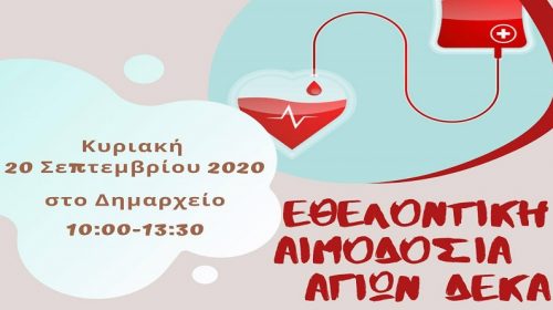 Εθελοντική Αιμοδοσία πραγματοποιείται την Κυριακή 20 Σεπτεμβρίου 2020 στους Αγίους Δέκα στα πλαίσια του προγράμματος #αιμοδοτούμε μαζί που υλοποιεί ο Παγκρήτιος Σύνδεσμος Εθελοντών Αιμοδοτών και Δωρητών Οργάνων Σώματος “Αιματοκρήτης” σε συνεργασία με τον Πολιτιστικό Σύλλογο Αγίων Δέκα, το Δήμο Γόρτυνας, τις ενορίες και άλλους τοπικούς φορείς όλης της Δημοτικής Ενότητας. Η αιμοδοσία θα πραγματοποιηθεί στο προαύλιο του Δημαρχείου από τις…