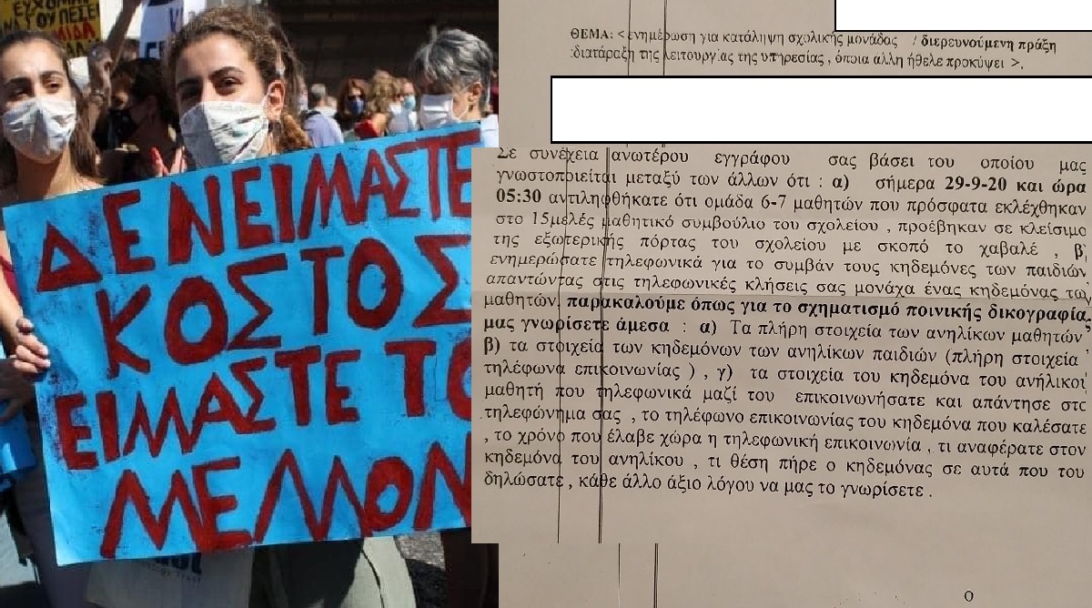 Ποινικές διαδικασίες σε βάρος μαθητών που συμμετείχαν σε καταλήψεις αλλά και των κηδεμόνων τους, ξεκινά η Αστυνομία στην Κρήτη! Μάλιστα με ένα έγγραφο που θυμίζει άλλες εποχές, ζητά από εκπαιδευτικούς να “καρφώσουν” τους μαθητές τους, δίνοντας τα πλήρη στοιχεία τους καθώς και τα πλήρη στοιχεία των κηδεμόνων τους!