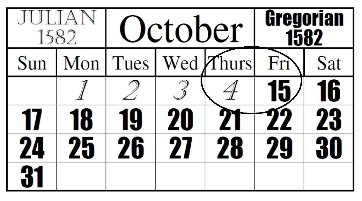 Η 4η Οκτωβρίου 1582 ήταν η τελευταία ημέρα του Ιουλιανού Ημερολογίου. Η αμέσως επόμενη ημέρα και 1η του Γρηγοριανού Ημερολογίου ήταν η 15η Οκτωβρίου. Οι ημέρες από τις 5 Οκτωβρίου έως και τις 14 Οκτωβρίου «δεν υπήρξαν ποτέ», καθώς απαλείφτηκαν, προκειμένου οι ημερομηνίες να εναρμονιστούν με το νέο Γρηγοριανό Ημερολόγιο.