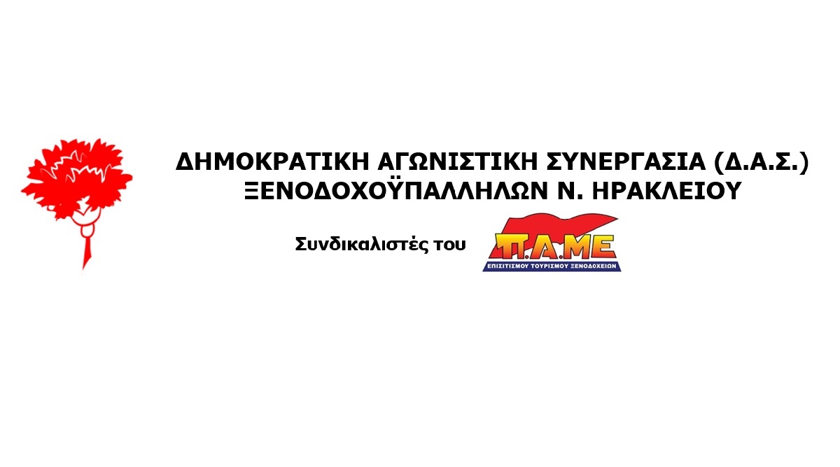 Στο συλλαλητήριο των σωματείων την Τρίτη 13 Οκτώβρη, στις 7 μ.μ., στην Πλατεία Ελευθερίας, στο Ηράκλειο, καλεί η Δημοκρατική Αγωνιστική Συνεργασία Ξενοδοχοϋπαλλήλων.