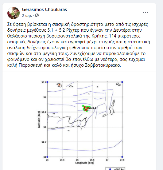 “Σε ύφεση βρίσκεται η σεισμική δραστηριότητα μετά από τις ισχυρές δονήσεις μεγέθους 5,1 + 5,2 Ρίχτερ που έγιναν την Δευτέρα στην θαλάσσια περιοχή βορειοανατολικά της Κρήτης. 114 μικρότερες σεισμικές δονήσεις έχουν καταγραφεί μέχρι στιγμής και η στατιστική ανάλυση δείχνει φυσιολογική φθίνουσα πορεία στον αριθμό των σεισμών και στα μεγέθη τους. Συνεχίζουμε να παρακολουθούμε το φαινόμενο και αν χρειαστεί θα επανέλθω με νεότερα, σας εύχομαι καλή Παρασκευή και καλό και ήσυχο Σαββατοκύριακο”.