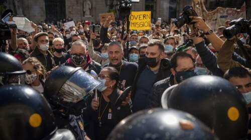 «Θα πεθάνουμε από την πείνα»: Εκατοντάδες διαδηλωτές συγκεντρώθηκαν σήμερα στη Βαρκελώνη για να διαμαρτυρηθούν για το κλείσιμο των μπαρ και των εστιατορίων στην Καταλονία, κατ’ εντολή των αρχών, για να αναχαιτιστεί η εξάπλωση της πανδημίας σε αυτήν την περιοχή της βορειοδυτικής Ισπανίας. Φωνάζοντας συνθήματα όπως «Όχι στο κλείσιμο», οι διαδηλωτές, στην πλειονότητά τους εργαζόμενοι στον τομέα της εστίασης, συγκεντρώθηκαν στην…
