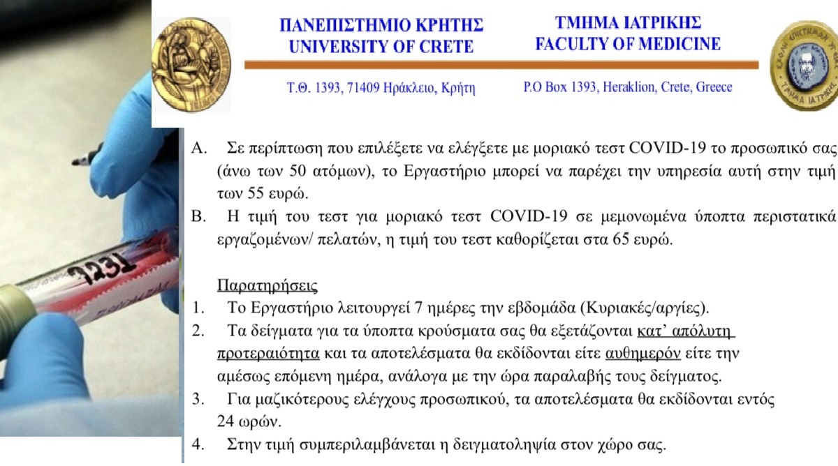 Το “λεπτό” θέμα είναι ότι όλες αυτές οι υπηρεσίες τιμολογούνται και μάλιστα αρκετά καλά! Στην επιστολή που έχει στείλει στα σχολεία αλλά και σε άλλες υπηρεσίες, επιχειρήσεις και φορείς ώστε να πείσει για μαζικά τεστ, χρησιμοποιώντας μάλιστα, εκτός από την ακαδημαϊκή του ιδιότητα και το λογότυπο του Πανεπιστημίου Κρήτης, έχει τις εξής τιμές για κάθε τεστ: