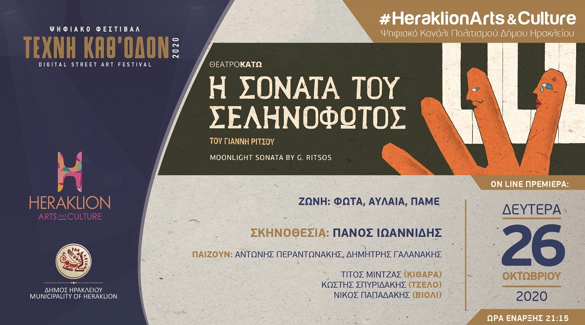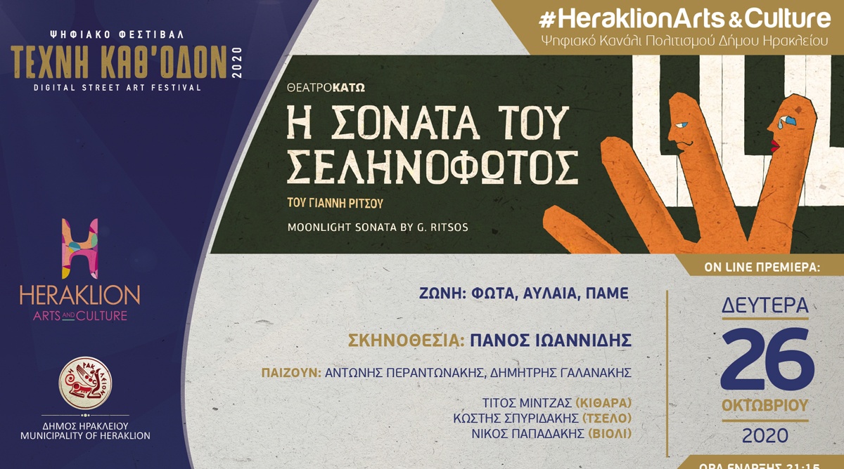 Με την «Σονάτα του Σεληνόφωτος» του Γιάννη Ρίτσου, από το Θέατρο «Κάτω», συνεχίζονται την Δευτέρα 26 Οκτωβρίου οι προβολές στο ψηφιακό κανάλι πολιτισμού του Δήμου Ηρακλείου.