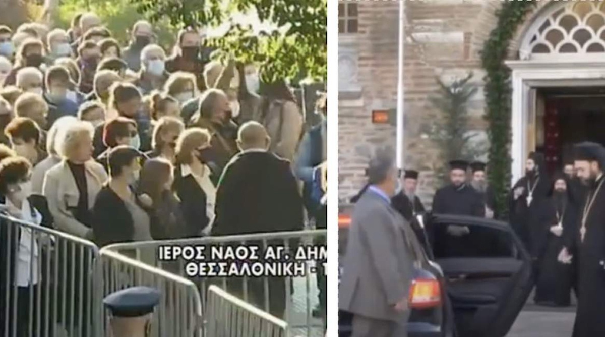 Ουρές και συνωστισμός κυριάρχησαν σήμερα το πρωί έξω από τον Ιερό Ναό του Αγίου Δημητρίου στη Θεσσαλονίκη κατά την έναρξη της θείας λειτουργίας ανήμερα της θρησκευτικής γιορτής.
