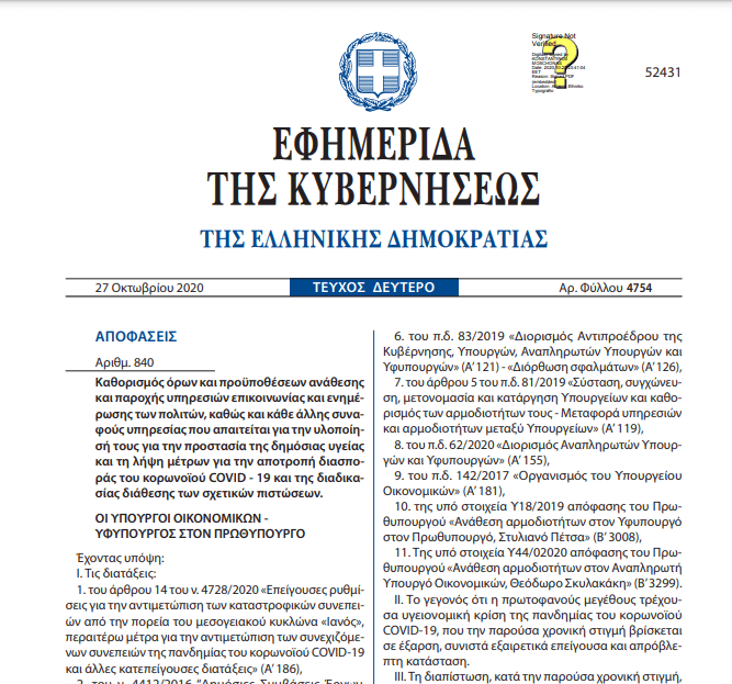 Ειδικότερα, την Τρίτη δημοσιεύτηκε στο Φύλλο Εφημερίδας της Κυβέρνησης η Κοινή Υπουργική Απόφαση 840/2020 (ΦΕΚ 4754/Β/27-10-2020) για τη χρηματοδότηση των Μέσων Μαζικής Ενημέρωσης. Η απόφαση που υπογράφουν ο υφυπουργός Οικονομικών, Θεόδωρος Σκυλακάκης και ο κυβερνητικός εκπρόσωπος, Στέλιος Πέτσας, αφορά «τη μετάδοση μηνυμάτων από τους πανελλαδικούς ενημερωτικούς τηλεοπτικούς σταθμούς της ανώνυμης εταιρείας “Ελληνική Ραδιοφωνία Τηλεόραση Ανώνυμη Εταιρεία (Ε.Ρ.Τ. Α.Ε.)” και τους τηλεοπτικούς σταθμούς των παρόχων περιεχομένου επίγειας ψηφιακής τηλεοπτικής ευρυεκπομπής ελεύθερης λήψης εθνικής εμβέλειας ενημερωτικού προγράμματος γενικού περιεχομένου (“Μέσα Μαζικής Ενημέρωσης”) κατά παρέκκλιση ειδικότερων διατάξεων που αφορούν στη μετάδοση των σχετικών μηνυμάτων από αυτά».