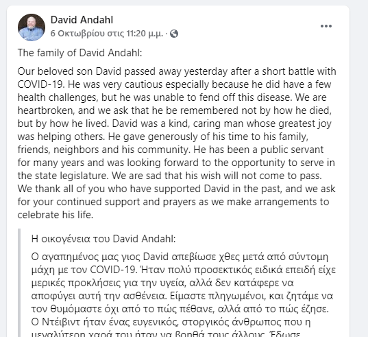 Ο Ντέιβιντ Άνταλ, κτηνοτρόφος και επιχειρηματίας, πέθανε την 5η Οκτωβρίου, σε ηλικία 55 ετών, «έπειτα από σύντομη μάχη με την COVID-19», γνωστοποίησε η οικογένεια του μέσω της σελίδας της εκστρατείας του για μια έδρα στην πολιτειακή Βουλή των Αντιπροσώπων στον ιστότοπο κοινωνικής δικτύωσης Facebook.