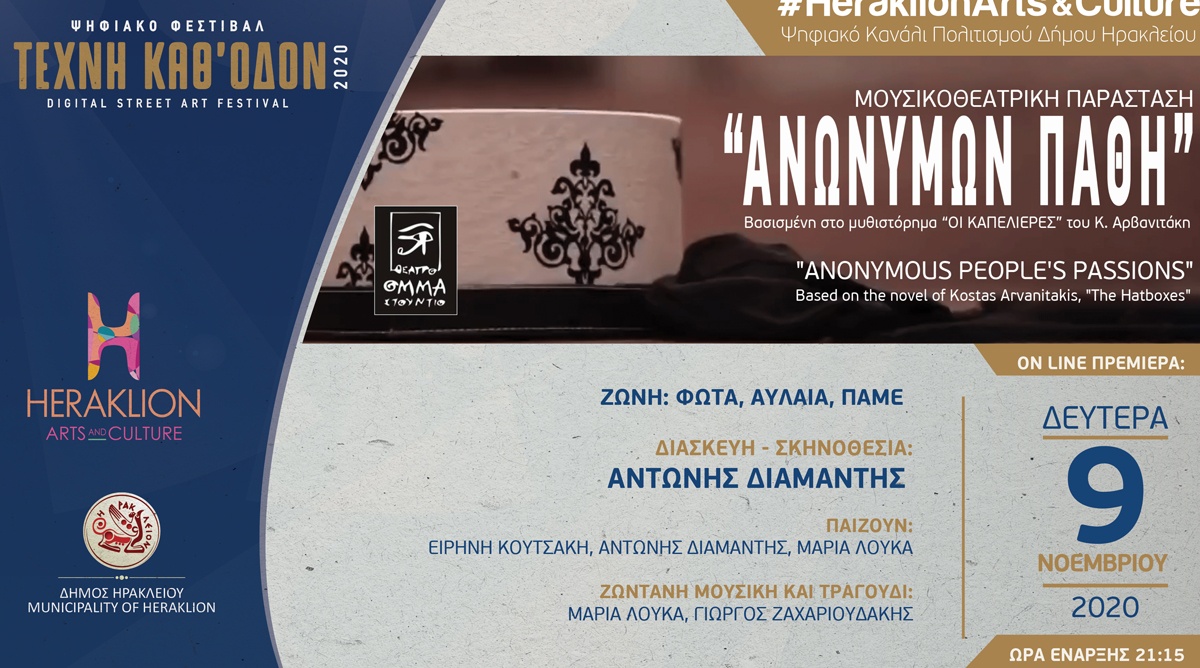 Με την μουσικοθεατρική παράσταση «ΑΝΩΝΥΜΩΝ ΠΑΘΗ» από το θέατρο ΟΜΜΑ Στούντιο, συνεχίζονται την Δευτέρα 9 Νοεμβρίου 2020 οι προβολές στο ψηφιακό κανάλι πολιτισμού του Δήμου Ηρακλείου Heraklion Art & Culture.