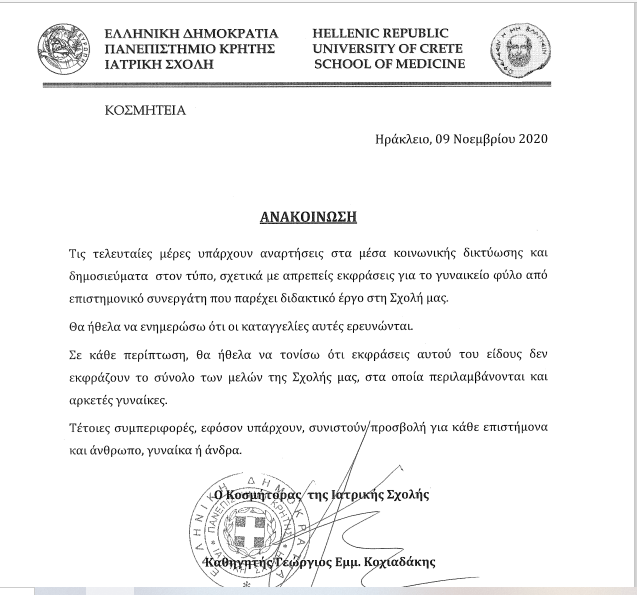 Την καταγγελία δημοσιοποίησε με ανάρτησή του το Candiadoc, προκαλώντας την παρέμβαση του Κοσμήτορα της Ιατρικής Σχολής, καθηγητή Γιώργου Κοχιαδάκη.
