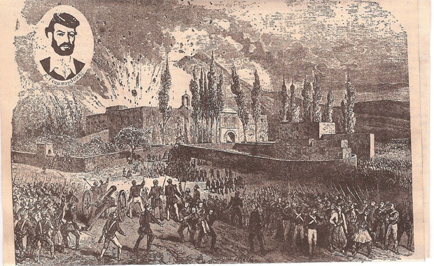 Η πολιορκία του Αρκαδίου, στην πρώτη εικόνα για το συγκλονιστικό γεγονός,που μεταδόθηκε στην Ευρώπη . Είχε δημοσιευτεί στην αγγλική εφημερίδα “Illustrated London News”, τον Ιανουάριο του 1867