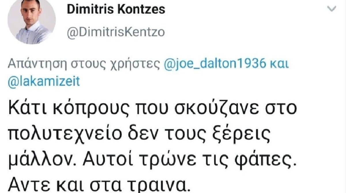 Ο Δημήτρης Κοντζές, προβεβλημένο στέλεχος της ΟΝΝΕΔ και υποψήφιος δημοτικός σύμβουλος στη Νέα Σμύρνη, προχώρησε σήμερα σε μια αήθη επίθεση εν όψει της επετείου του Πολυτεχνείου. Εκπροσωπώντας το «νέο ήθος» της ελληνικής δεξιάς επιδόθηκε σε έναν συνδυασμό χυδαιολογίας και τραμπουκισμού που απέληξε στην εφιαλτική προσταγή «άντε και στα τρένα». Οι νοσταλγοί του Ολοκαυτώματος δεν έχουν θέση στη Δημοκρατία μας. Καμία ανοχή στον χρυσαυγιτισμό! Απαιτούμε την καταδίκη των απόψεων του Δημήτρη Κοντζε και καλούμε τη Νέα Δημοκρατία να τον διαγράψει άμεσα.