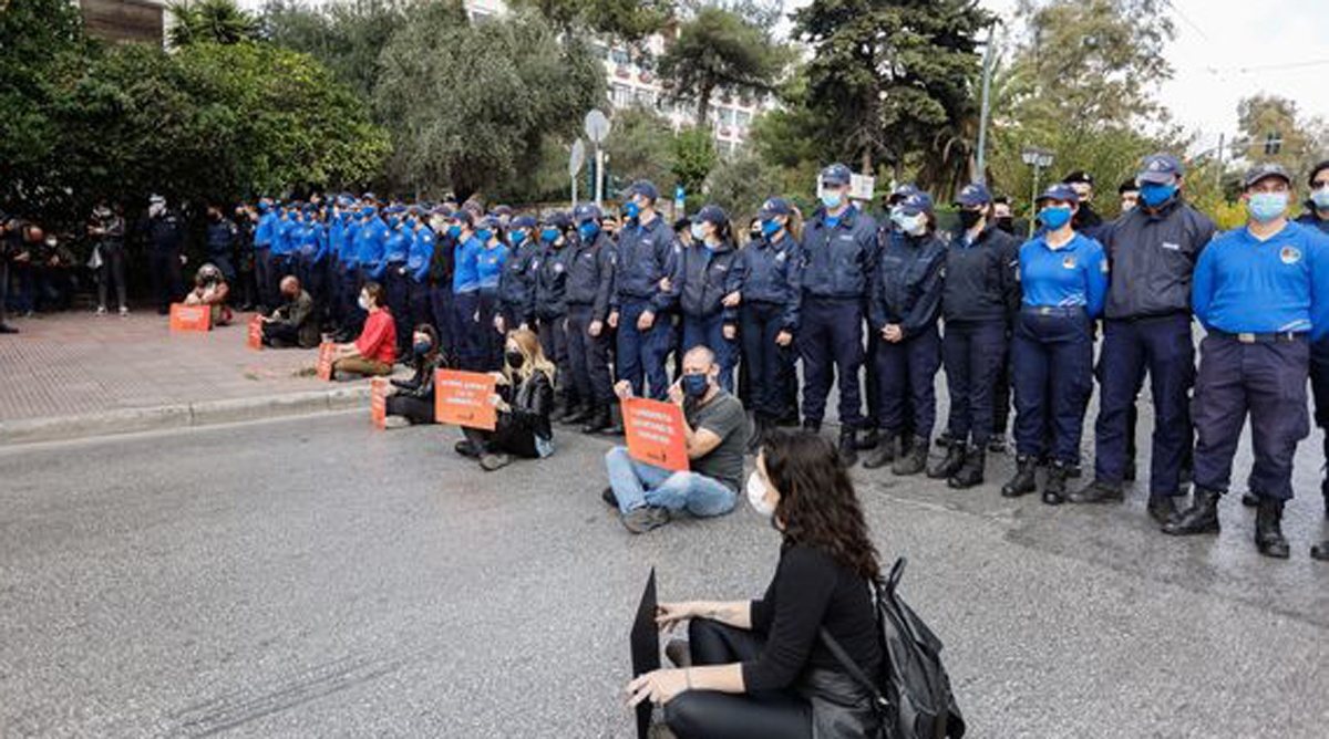 Οι χιλιάδες αστυνομικοί που βρίσκονται στο κέντρο της Αθήνας κάπως πρέπει να αιτιολογήσουν την παρουσία τους. Εν μέσω λοιπόν της χουντικού τύπου απαγόρευσης της κυβέρνησης των συναθροίσεων «για υγειονομικούς λόγους», αστυνομικοί συνωστίζονται κολλητά ο ένας με τον άλλον πίσω από τους επτά βουλευτές του ΜέΡΑ25 που πραγματοποίησαν καθιστική διαμαρτυρία.