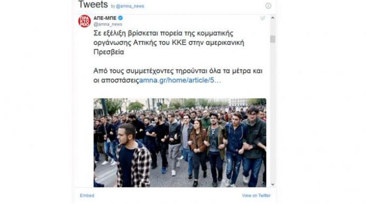 «Το ΑΠΕ – ΜΠΕ, με φωτογραφία από άλλη συγκέντρωση, που πραγματοποιήθηκε προφανώς σε άλλο χρόνο και όχι από τη σημερινή συγκέντρωση του ΚΚΕ, εικονογραφεί την είδηση για την κατάθεση στεφάνου εκ μέρους του ΚΚΕ και της ΚΝΕ, και την συγκέντρωση έξω από την αμερικάνικη πρεσβεία και το Πάρκο Ελευθερίας, που πραγματοποίησαν δυνάμεις της ΚΟ Αττικής του ΚΚΕ στο πλαίσιο του συμβολικού αγωνιστικού εορτασμού της επετείου του Πολυτεχνείου! Φυσικά, δεν αναφέρει πουθενά ότι πρόκειται για φωτογραφία αρχείου.