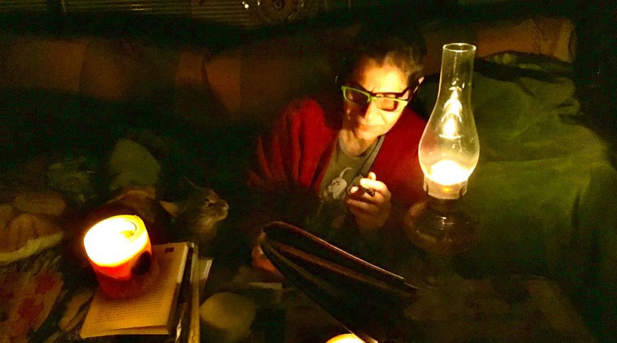 Η Μαργαρίτα Θεοδωράκη ανέβασε δύο φωτογραφίες όπου διαβάζει με μία λάμπα πετρελαίου.