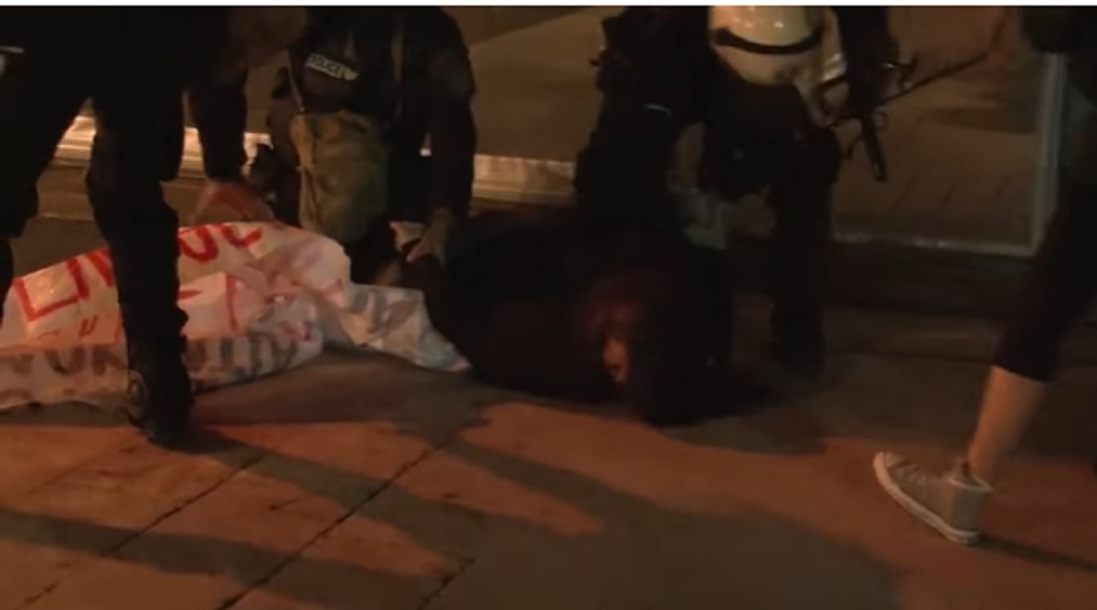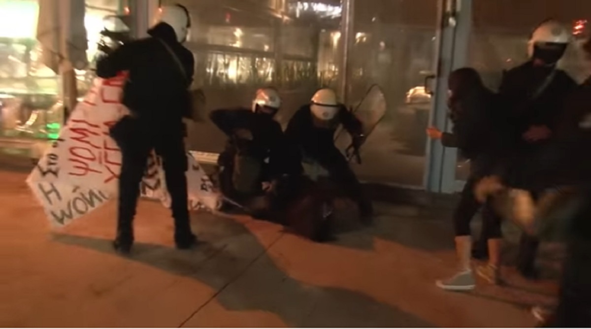 Είδαμε πάνοπλους άνδρες των ΜΑΤ να αφαιρούν το πανό για το Πολυτεχνείο από φοιτήτρια της Ιατρικής, να την πετάνε μπρούμητα στο έδαφος και στην συνέχεια να την ακινητοποιούν με τα χέρια πίσω και τα γόνατα πάνω στο σώμα της νεαρής!
