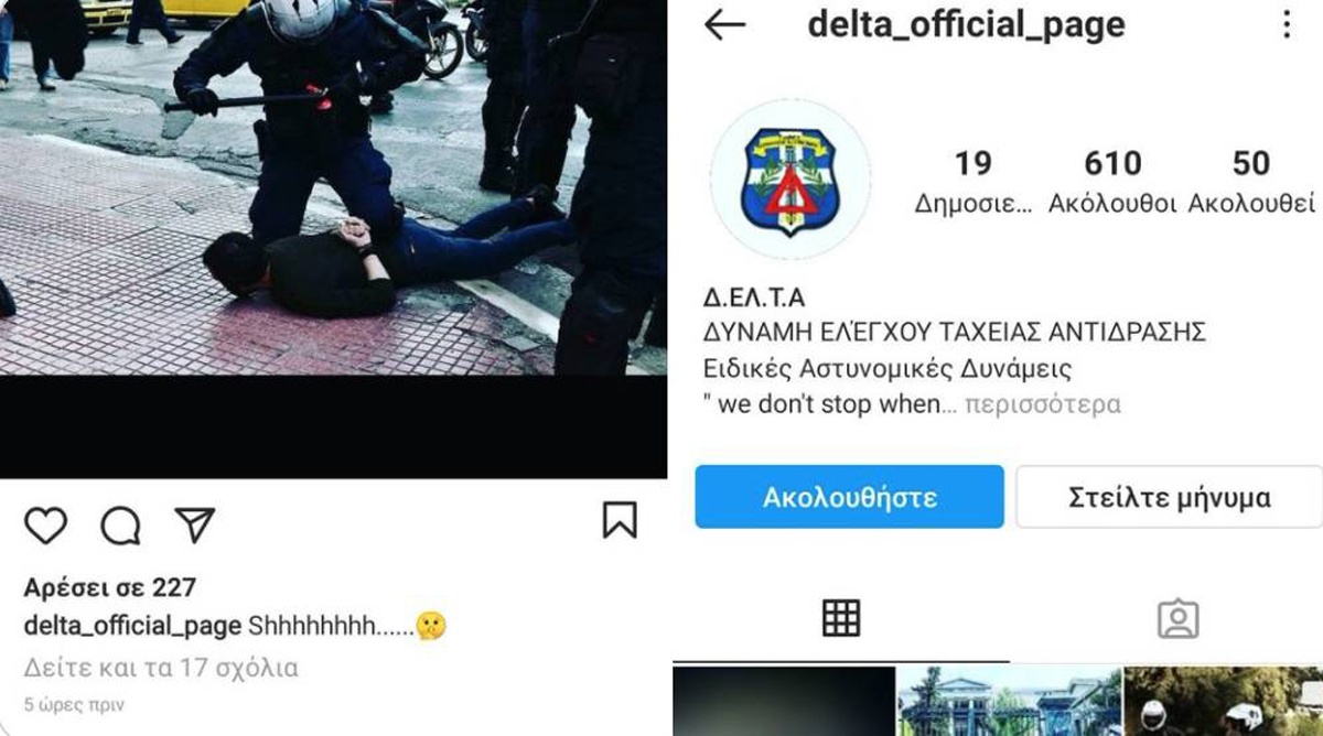 Λογαριασμός με το όνομα «delta official page» («επίσημη σελίδα της ΔΕΛΤΑ») διατηρείται στο Instagram, ο οποίος φέρει τον τίτλο της ομάδας ΔΕΛΤΑ της αστυνομίας. Σαν να είναι κάποιο κλαμπ ή σύνδεσμος οπαδών που έχουν αντίστοιχες παρουσίες στα μέσα κοινωνικής δικτύωσης, η συγκεκριμένη σελίδα διαφημίζει μέσα από φωτογραφικό υλικό τα κατορθώματα της ομάδας ΔΕΛΤΑ, δηλαδή την τρομοκρατική, κατασταλτική της δράση.