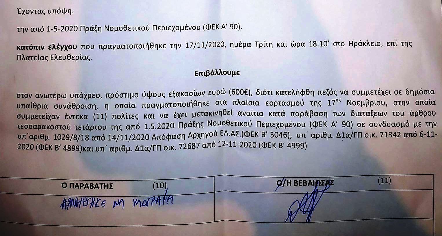 Ο Πρωθυπουργός δεν μπορεί να γεννήσει λεωφορεία, η χθεσινή όμως νύχτα γέννησε παράδοξα περιστατικά Σύμφωνα με την ανακοίνωση της ΕΛ.ΑΣ. χθες στο Ηράκλειο προσήχθησαν 65 άτομα, επιβλήθηκαν 53 πρόστιμα των 300 €, και έγιναν δύο συλληψεις. Η αλήθεια για όλους τους παραπάνω αριθμούς είναι τελείως διαφορετική. Η ΕΛ.ΑΣ. μάζεψε χθες 130 – 140 άτομα σε όλο το Ηράκλειο, και κυρίως στο ιστορικό κέντρο της πόλης. Πολλοί προσήχθησαν με τελείως αστήρικτες δικαιολογίες (π.χ. ότι δεν μπορεί να έχεις στείλει μήνυμα για ατομική άσκηση και να σε πιάνουν με καφέ στο χέρι δίπλα στο σπίτι σου, ή να έχεις στείλει το ίδιο μήνυμα και να σε πιάνουν σε απόσταση 20 λεπτά από το σπίτι σου). Οι περισσότεροι αφέθηκαν ελεύθεροι χωρίς πρόστιμο μετά από ταλαιπωρία αρκετών ωρών δική τους και των οικείων τους που έσπευδαν στο Αστυνομικό Μέγαρο. Επειδή μείναμε μπροστά στο Μέγαρο μέχρι που έφυγε και το τελευταίο από τα άτομα που προσήχθησαν, διαπιστώσαμε ότι επιβλήθηκαν ελάχιστα πρόστιμα των 300 €. Στη μεγάλη πλειοψηφία επιβλήθηκαν πρόστιμα των 600 € με την αιτιολογία ότι “κατελήφθη να συμμετέχει σε υπαίθρια δημόσια συνάθροιση, η οποία πραγματοποιήθηκε στα πλαίσια του εορτασμού της 17ης Νοεμβρίου, στην οποία συμμετείχαν 11 πολίτες, και να έχει μετακινηθεί αναίτια”. Εμείς γνωρίζουμε για τουλάχιστον 10 πρόστιμα των 600 €, για τα οποία θα ασκηθει ένσταση. Για αυτά τα πρόστιμα ουδεμία αναφορά γίνεται στην ανακοίνωση της ΕΛ.ΑΣ., εκτός εάν ήθελε υποτεθεί ότι τα υπολογίζουν ως διπλά στα 52 πρόστιμα που επιβλήθηκαν (δηλαδή δύο πρόστιμα των 300 €). Γνωρίζουμε επίσης για μια προσαγωγή που μετατράπηκε σε σύλληψη για απείθεια, για την οποία έγινε προανάκριση παρουσία του Μιχάλη Σαρχιανάκη, και ο συλληφθείς αφέθηκε ελεύθερος. Αν όμως η 17 Νοέμβρη αποκαλείται “εορτασμός” γιατί απαγορεύεται, και αν κάποιος μετακινήθηκε για να μετάσχει στον εορτασμό, γιατί η μετακίνησή του θεωρείται αναίτια; Σημειώνουμε ότι όλες και όλοι ήταν εφοδιασμένοι με έντυπα μετακίνησης, ή είχαν αποστείλει σχετικά sms. Όλα αυτά θα εκτεθούν αναλυτικά στις ενστάσεις που θα υποβάλλουμε. Ήδη διακινείται μεγάλος αριθμός αξιόλογων νομικών κειμένων μεταξύ των συναδέλφων πανελλήνια.