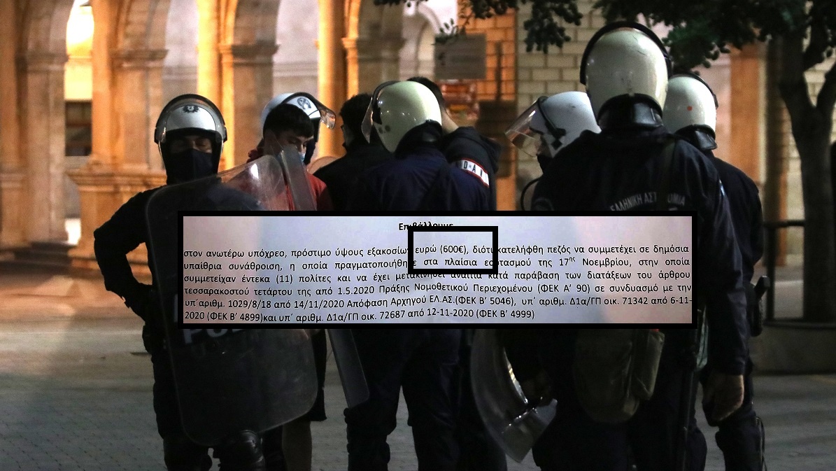 Καταγγέλλουμε την επίθεση στο μπλοκ του ΚΚΕ, με οχήματα εκτόξευσης νερού, ξύλο και χημικά, στην οδό Πανεπιστημίου, τον άγριο ξυλοδαρμό της οικογένειας Κατή στα Σεπόλια και τον Κολωνό, την αναίτια άσκηση σωματικής και ψυχολογικής βίας, τις προσαγωγές και την επιβολή εξοντωτικών προστίμων σε όλες τις πόλεις της χώρας, και ειδικά για το Ηράκλειο τη σύλληψη ενός ατόμου και τις παντελώς αναιτιολόγητες προσαγωγές, που έφθασαν 145 με την επιβολή παράνομων προστίμων από την ΕΛ.ΑΣ σε εργαζόμενους, άνεργους και φοιτητές, ύψους 300 και 600 ευρώ και γενικά κάθε μορφή βίας και καταστολής ενάντια σε όσους προσπάθησαν να τιμήσουν με πλήρη τήρηση όλων των υγειονομικών μέτρων τη ζωντανή μνήμη του Πολυτεχνείου ή απλά είχαν την ατυχία να βρεθούν στον δρόμο των κατασταλτικών μονάδων της ΕΛ.ΑΣ.