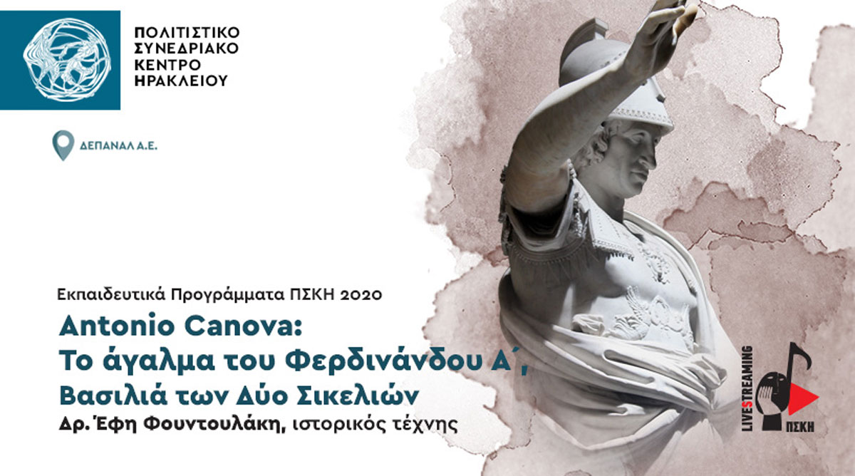 Με τη δεύτερη ομιλία του κύκλου των εκπαιδευτικών προγραμμάτων του Πολιτιστικού Συνεδριακού Κέντρου Ηρακλείου – ΠΣΚΗ, “Τέχνη και Πολιτική Επικοινωνία | Antonio Canova: Άγαλμα του Φερδινάνδου Α΄, Βασιλιά των Δύο Σικελιών”, με εισηγήτρια την ιστορικό τέχνης, Δρ. Έφη Φουντουλάκη, συνεχίζεται την Πέμπτη 3 Δεκεμβρίου, στις 19:00, το πρόγραμμα μεταδόσεων με Live Streaming του ΠΣΚΗ.