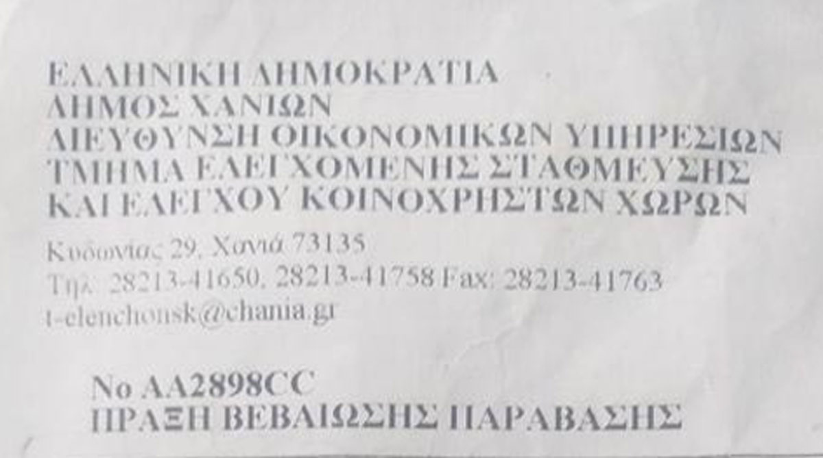 “Αλήθεια εκεί στην αρμόδια Υπηρεσία του Δήμου Χανίων πριν τοποθετήσετε ή αποστείλετε μια κλήση για ελεγχόμενη στάθμευση ελέγχετε την ημερομηνία; Είναι δυνατόν να βεβαιώνεται κλήση πριν 50 χρόνια; Ο κάτοχος του οχήματος είναι 80 ετών κατοικεί στην Κίσαμο και αναγκάσθηκε δυο φορές να έρθει στην Υπηρεσία σας για να του ακυρώσετε την κλήση”, σχολιάζει ο κ. Κουτσαυτάκης!