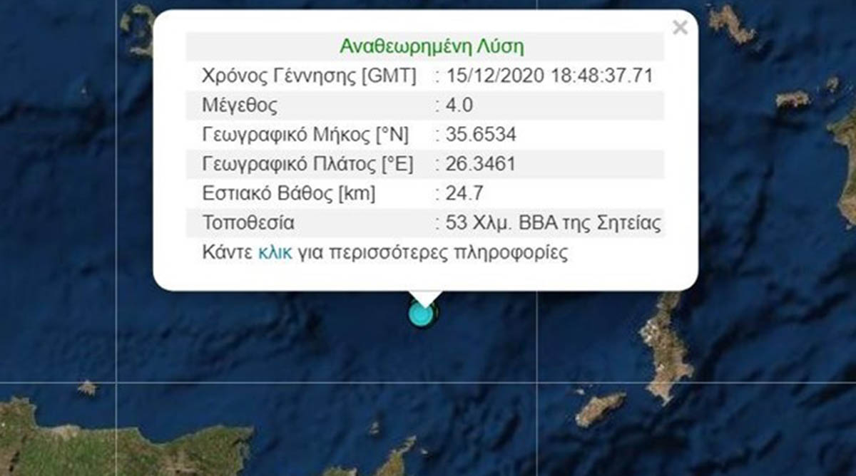 Σεισμική δόνηση σημειώθηκε πριν από λίγο στη θαλάσσια περιοχή βόρεια, βορειοανατολικά της Σητείας. Σύμφωνα με την Αυτόματη Λύση του Γεωδυναμικού Ινστιτούτου Αθηνών ο σεισμός είχε μέγεθος 4 Ρίχτερ. Το επίκεντρο εντοπίζεται 53 χιλιόμετρα βόρεια, βορειοανατολικά της Σητείας και το εστιακό βάθος υπολογίζεται στα 24,7 χιλιόμετρα.