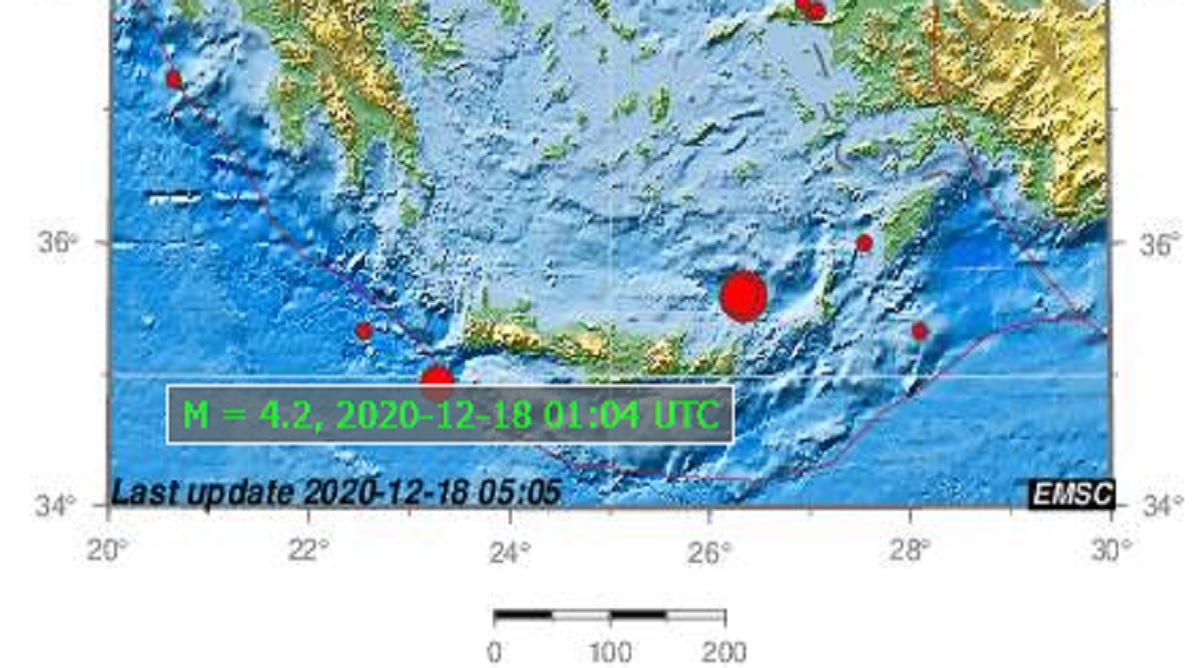 | Distances | 110 km ENE of Irákleion, Greece / pop: 137,000 / local time: 03:04:05.8 2020-12-18 49 km N of Sitia, Greece / pop: 8,700 / local time: 03:04:05.8 2020-12-18 |