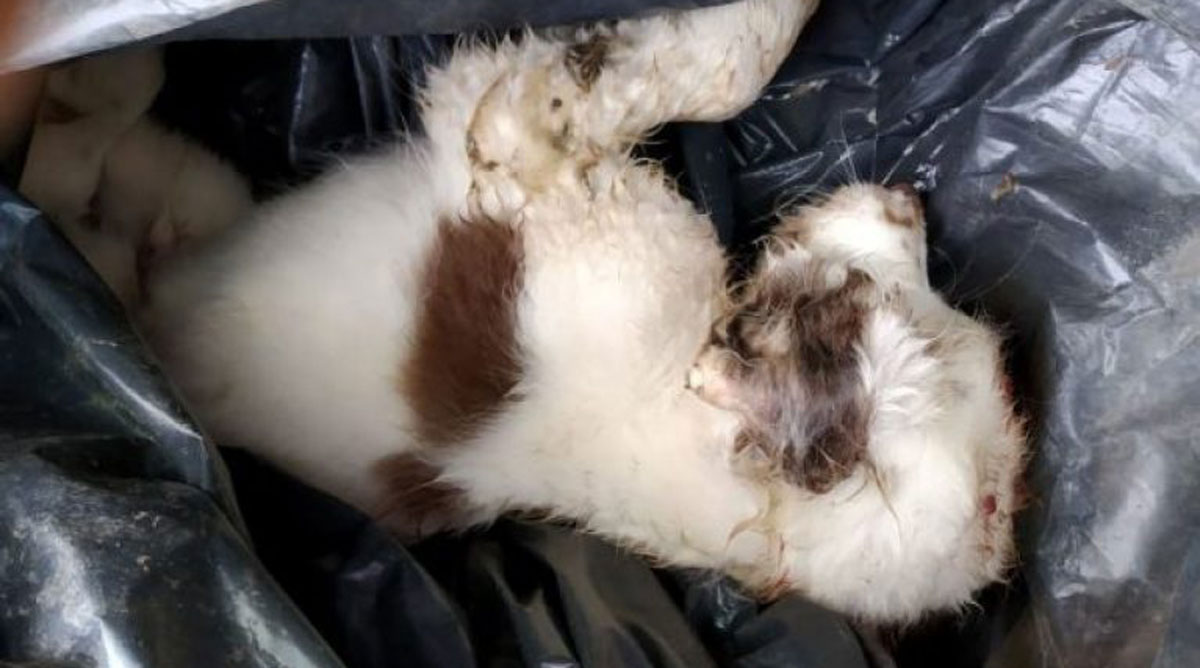 Ανοίγοντας τη σακούλα,είδε δύο αιματοβαμμένα κουταβάκια,το ένα εκ των δύο ήταν νεκρό και το άλλο ετοιμοθάνατο.