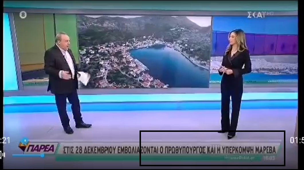 Όλα έγιναν στη διάρκεια της εκπομπής «ΣΚ Παρέα» με τον Δημ. Καμπουράκη. Παρουσιάζοντας τα θέματα,  στην οθόνη εμφανίστηκε στιγμιαία η λεζάντα: «Στις 28 Δεκεμβρίου εμβολιάζονται ο πρωθυπουργός και η υπέρκομψη Μαρέβα».