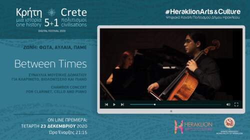 Με την συναυλία μουσικής δωματίου για κλαρινέτο, βιολοντσέλο και πιάνο “Between Times” συνεχίζονται την Τετάρτη 23 Δεκεμβρίου στις 21.15 οι προβολές στο ψηφιακό κανάλι πολιτισμού του Δήμου Ηρακλείου. Η συναυλία θα προβληθεί στον παρακάτω σύνδεσμο: https://youtu.be/RZl69onR4ds Το μουσικό αυτό ταξίδι περιλαμβάνει αγαπημένα έργα μουσικής δωματίου, όπως την Πρώτη Ραψωδία για κλαρινέτο και πιάνο του Claude Debussy, τα Τρία Φανταστικά Κομμάτια…