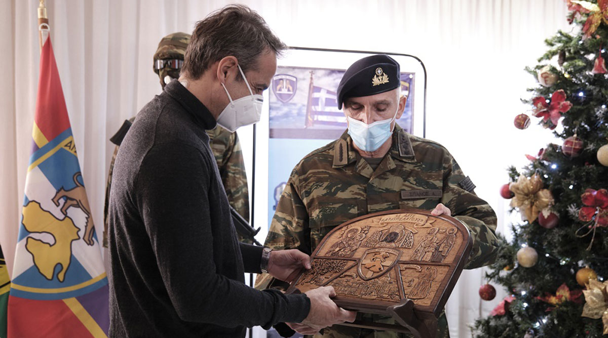 Στην 98η Ανώτερη Διοίκηση Ταγμάτων Εθνοφυλακής, στη Λέσβο, άκουσε από τη στρατιωτική μπάντα τα παραδοσιακά πρωτοχρονιάτικα, αλλά και τοπικά κάλαντα, ο Πρωθυπουργός Κυριάκος Μητσοτάκης.