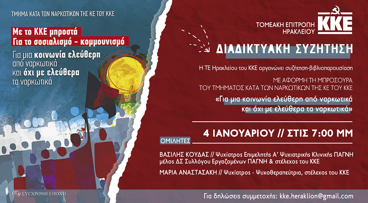 Η ΤΕ Ηρακλείου του ΚΚΕ οργανώνει συζήτηση-βιβλιοπαρουσίαση με αφορμή την μπροσούρα του Τμήματος κατά των Ναρκωτικών της ΚΕ του ΚΚΕ «Για μια κοινωνία ελεύθερη από ναρκωτικά και όχι με ελεύθερα τα ναρκωτικά», τη Δευτέρα 4 Ιανουαρίου, στις 7 μμ. Θα μιλήσει ο Βασίλης Κούδας, Ψυχίατρος Επιμελητής Α’ Ψυχιατρικής Κλινικής ΠΑΓΝΗ, μέλος του ΔΣ Συλλόγου Εργαζομένων ΠΑΓΝΗ & στέλεχος του ΚΚΕ και η Μαρία Αναστασάκη, Ψυχίατρος – Ψυχοθεραπεύτρια, στέλεχος του ΚΚΕ.
