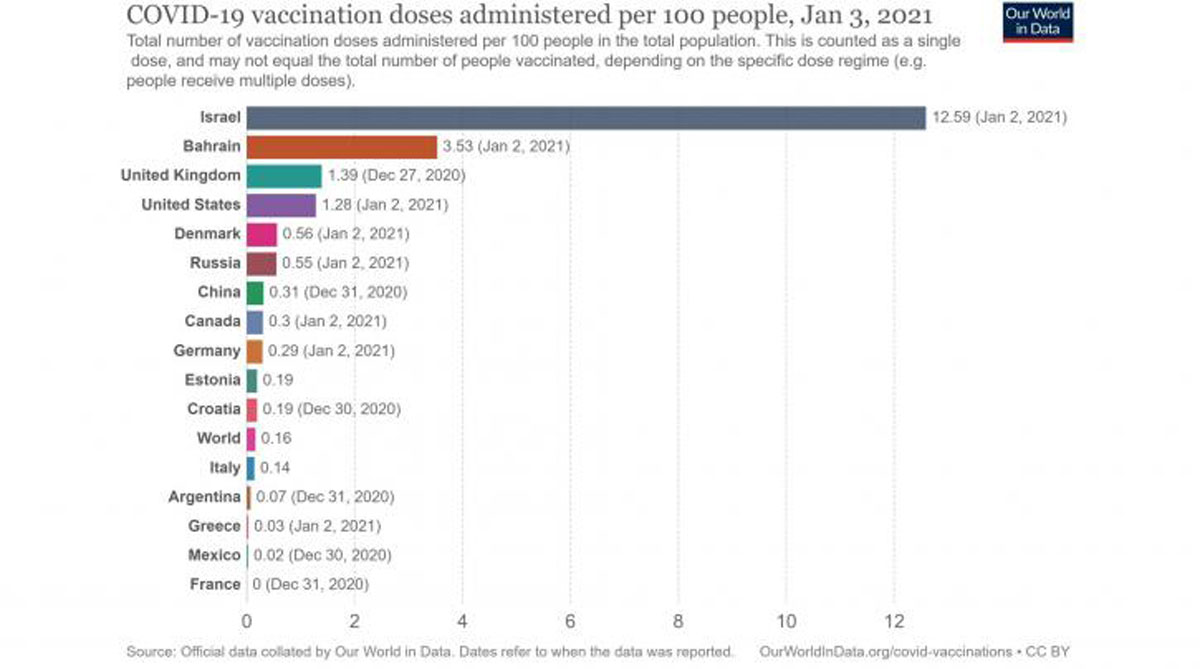 Το Ισραήλ έχει φτάσει το ποσοστό εμβολιασμού του πληθυσμού του (περίπου 9 εκατομμύρια) στο 12,6%, σύμφωνα με το γράφημα, ενώ η κυβέρνησή του ανακοίνωσε χθες ότι έχει ήδη εμβολιάσει 1 εκατομμύριο πολίτες του κατά της Covid-19, ήτοι πάνω από το 10%.