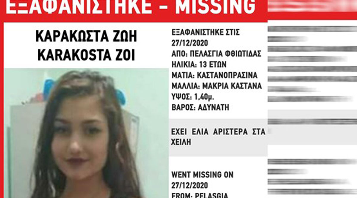 “Στις 27/12/2020, πρωινές ώρες, εξαφανίστηκε από το σπίτι της στην Πελασγία Φθιώτιδας, η Ζωή Καρακώστα, 13 ετών, ελληνικής καταγωγής. «Το Χαμόγελο του Παιδιού» προχώρησε σήμερα, κατόπιν Εισαγγελικής Εντολής, σε δημοσιοποίηση των στοιχείων της ανήλικης.