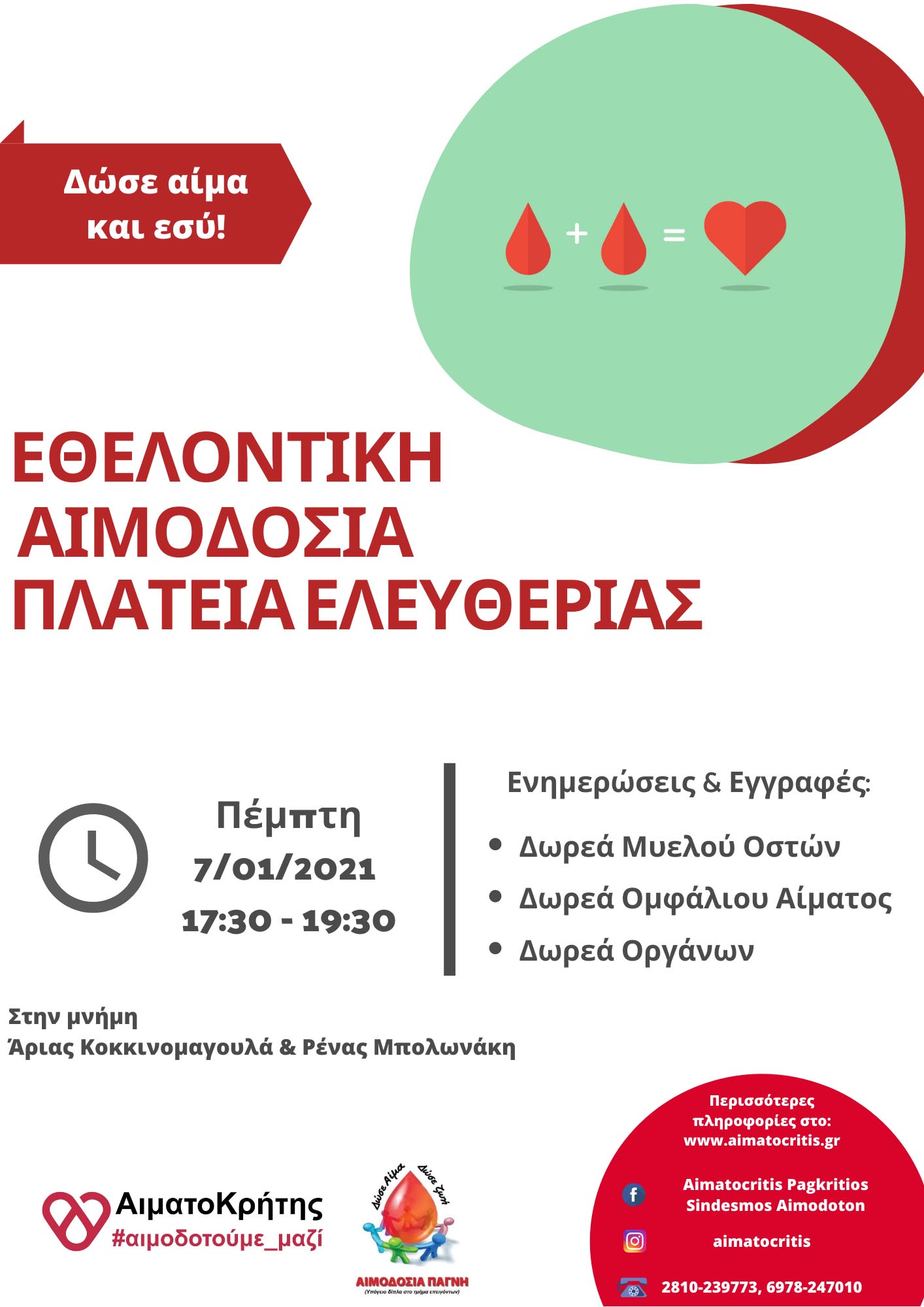 Ο Παγκρήτιος Σύνδεσμος Εθελοντών Αιμοδοτών και Δωρητών Οργάνων Σώματος «Αιματοκρήτης» διοργανώνει εθελοντική αιμοδοσία σήμερα Πέμπτη 07/01/21 και ώρες 17:30-19:30 στην πλατεία Ελευθερίας σε συνεργασία με την μονάδα αιμοδοσίας του Παγνη και καλεί τους εθελοντές αιμοδότες να προσέλθουν λόγω των σημαντικών αναγκών σε αίμα αυτήν την περίοδο.