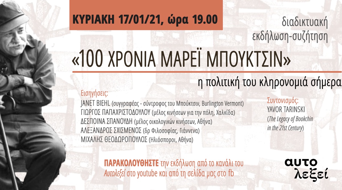 Φέτος, στις 14 Γενάρη, συμπληρώνονται 100 χρόνια από τη γέννηση του σπουδαίου στοχαστή και αγωνιστή Μάρρεϋ Μπούκτσιν. Πρόκειται για τον θεμελιωτή της κοινωνικής οικολογίας και για μία προσωπικότητα με σημαντική συνεισφορά στην εξέλιξη της ριζοσπαστικής δημοκρατικής θεωρίας και πράξης. Η σκέψη του, πάντοτε πολιτική και στραμμένη προς τη ριζική κοινωνική αλλαγή πέρα από Kράτος και Kεφάλαιο, έχει επηρεάσει τα κοινωνικά κινήματα σε όλο τον κόσμο αλλά και μία από τις σημαντικότερες επαναστατικές εμπειρίες της εποχής μας –τη Ροζάβα. Θεωρούμε ότι ο Μπούκτσιν είναι ένας από τους στοχαστές με τη σκέψη του οποίου είναι κρίσιμο να συνομιλούμε σήμερα και για αυτόν τον λόγο αναλαμβάνουμε τη διοργάνωση αυτής της συζήτησης.Συνομιλούμε με:– την Janet Biehl (συγγραφέα – σύντροφο του Μπούκτσιν, Burlington Vermont): «Η πολιτική κληρονομιά του Μπούκτσιν & η επανάσταση στη Ροζάβα»– τον Γιώργο Παπαχριστοδούλου (μέλος κινήσεων για την πόλη, Χαλκίδα): «Ο ελευθεριακός δημοτισμός & η σημασία της πόλης»– τη Δέσποινα Σπανούδη (μέλος οικολογικών κινήσεων, Αθήνα): «Πόλη & κοινωνική οικολογία»– τον Αλέξανδρο Σχισμένο (δρ Φιλοσοφίας, Γιάννενα): «Η πολιτική σκέψη του Μπούκτσιν & τα σύγχρονα κοινωνικά κινήματα»– τον Μιχάλη Θεοδωρόπουλο (Ηλιόσποροι, Αθήνα): «Η κληρονομιά του Μπούκτσιν στα συνεργατικά αγροτικά σχήματα & στα κοινοτικά εγχειρήματα αυτάρκειας-περμακουλτούρας»* Την κουβέντα θα συντονίσουν η Ιωάννα Μαραβελίδη και ο Yavor Tarinski του οποίου ο σχετικός συλλογικός τόμος Enlightenment and Ecology: The Legacy of Murray Bookchin in the 21st Century μόλις κυκλοφόρησε.ΚΥΡΙΑΚΗ 17/01/21, ώρα 7μ.μ.ΠΑΡΑΚΟΛΟΥΘΗΣΤΕ την εκδήλωση από το κανάλι του Αυτολεξεί στο youtube: