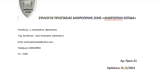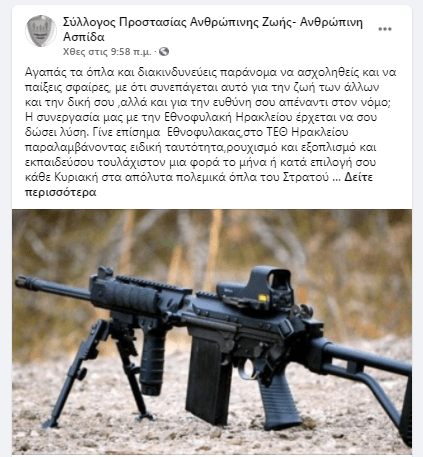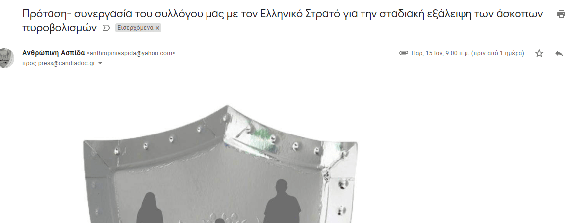 Ένα μήνυμα που μας προκάλεσε πολλές απορίες, λάβαμε χθες με το ηλεκτρονικό ταχυδρομείο. Ένας σύλλογος, με τον τίτλο “Σύλλογος Προστασίας Ανθρώπινης Ζωής- Ανθρώπινη Ασπίδα”, ανακοίνωνε ότι ο αντισυνταγματάρχης της Εθνοφυλακής (του Ελληνικού Στρατού, δηλαδή) στο Ηράκλειο δέχτηκε με χαρά τη συνεργασία μαζί του για την “εξάλειψη των άσκοπων πυροβολισμών”.