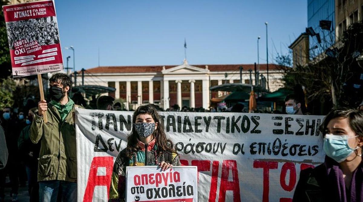 Πανεκπαιδευτικό συλλαλητήριο με μεγάλη συμμετοχή παρά τις απαγορεύσεις σήμερα στην Αθήνα, με φοιτητές και μαθητές να πορεύονται προς τη Βουλή, διαδηλώνοντας ενάντια στο νομοσχέδιο Κεραμέως – Χρυσοχοϊδη που θέλει να βάλει «στο γύψο» τα ΑΕΙ.