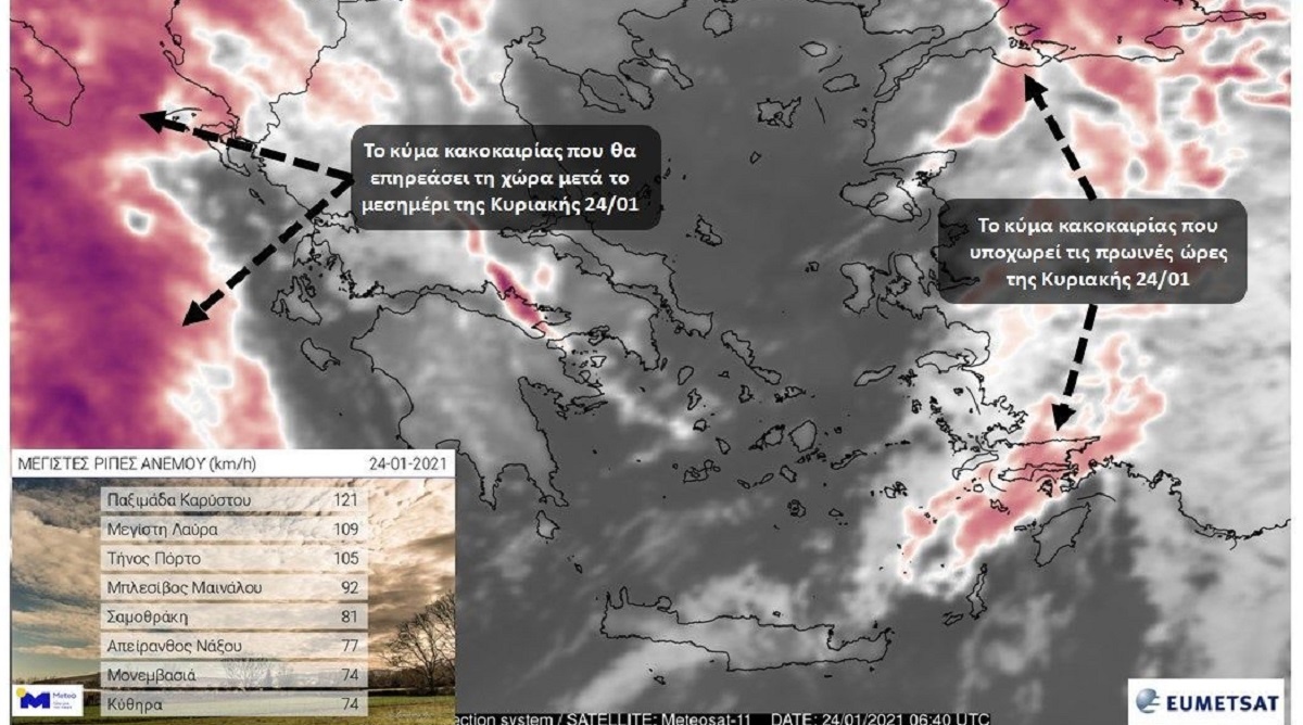 Στη δορυφορική εικόνα που ακολουθεί αποτυπώνονται τα νέφη των δύο μετώπων στις 08:40 ώρα Ελλάδας, ενώ εμπεριέχεται πίνακας με τις 8 ισχυρότερες ριπές ανέμου έως το πρωί της Κυριακής σύμφωνα με το δίκτυο αυτόματων μετεωρολογικών σταθμών του ΕΑΑ.