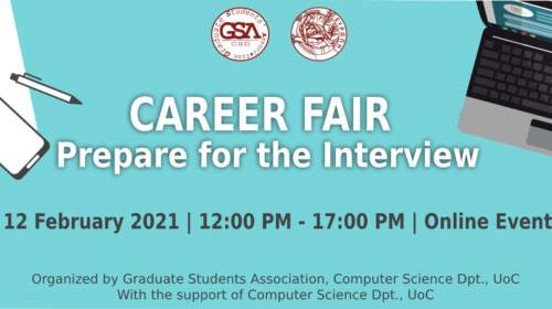 Την Παρασκευή 12 Φεβρουαρίου 2021 στις 12:00 – 17:00, ο σύλλογος μεταπτυχιακών-διδακτορικών φοιτητών του Τμήματος Επιστήμης Υπολογιστών του Πανεπιστημίου Κρήτης, με την υποστήριξη του Πανεπιστημίου Κρήτης, πραγματοποιεί την εκδήλωση «Ημέρα καριέρας: Προετοιμασία για την συνέντευξη». Λόγω των περιορισμών της πανδημίας, η εκδήλωση θα πραγματοποιηθεί διαδικτυακά. Η εκδήλωση είναι η πρώτη από μια σειρά δράσεων που θα πραγματοποιήσει ο σύλλογος μας…