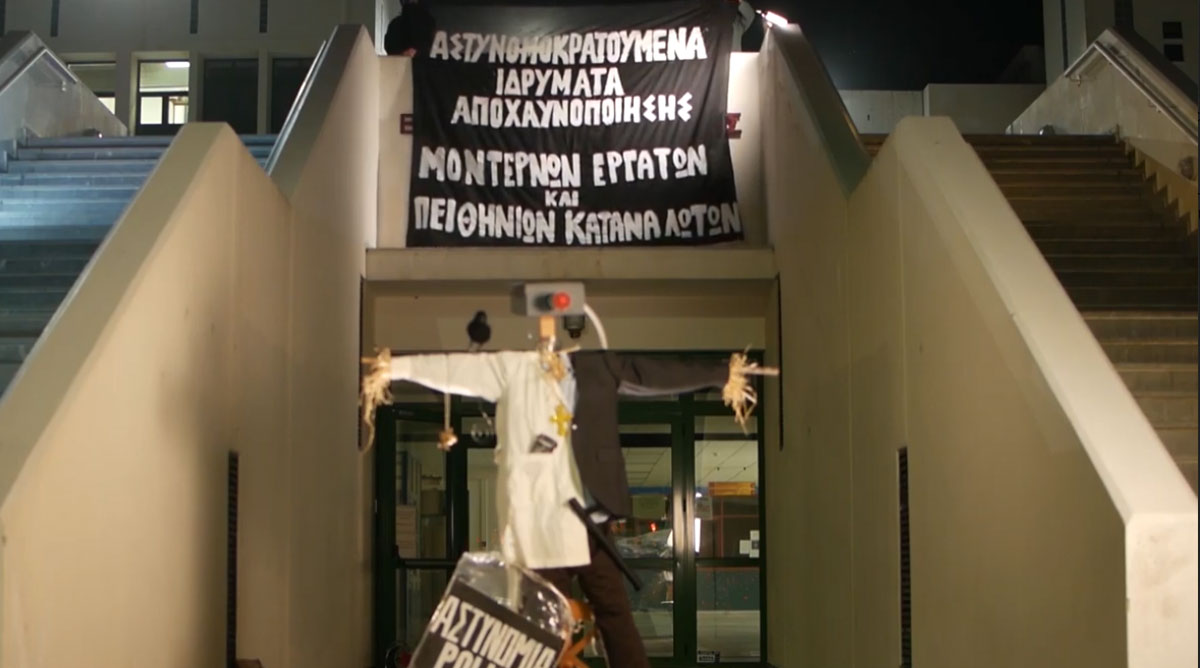 Καλλιτεχνική παρέμβαση κατά της αστυνομίας στα Πανεπιστήμια πραγματοποίησε ομάδα ατόμων στο Ηράκλειο.