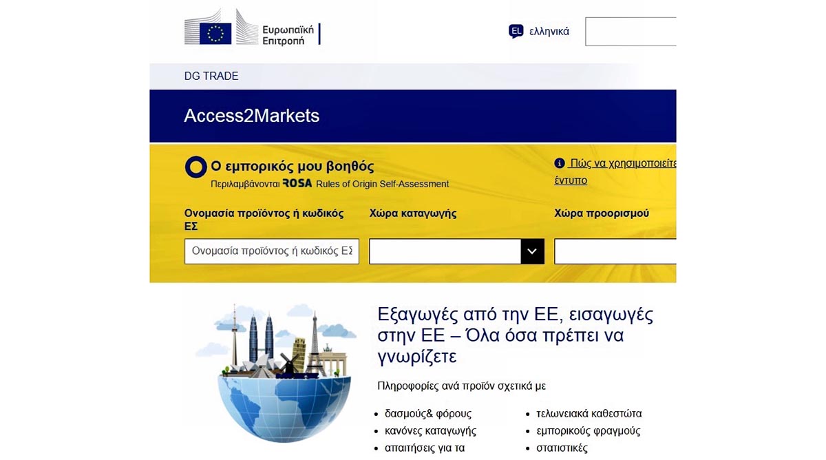 Στο Access2Markets οι ενδιαφερόμενοι μπορούν να βρουν όλα όσα πρέπει να γνωρίζουν, σχετικά με τους δασμούς, τους φόρους, τους κανόνες και τις απαιτήσεις που ισχύουν για τα προϊόντα σε όλες τις χώρες της Ευρωπαϊκής Ένωσης, καθώς και σε 120 ακόμη αγορές, ανά τον κόσμο.
