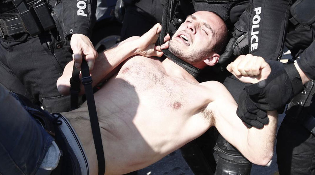 Όπως καταγράφεται στο βίντεο – ντοκουμέντο, οι αστυνομικοί σέρνουν και τραβολογούν τον φοιτητή που είναι γυμνός από τη μέση και πάνω ενώ κάποιος ακούγεται να λέει να κάνουν αλυσίδα ώστε να μη φανεί τι ακριβώς συμβαίνει.