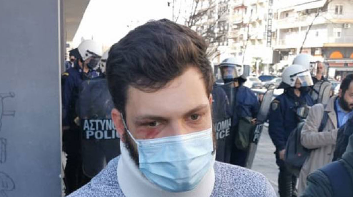 «Θα κάνουμε μήνυση στους αστυνομικούς που χτύπησαν βάναυσα το παιδί κατά την ώρα της σύλληψής του, μπροστά σε δεκάδες αυτόπτες μάρτυρες, αναίτια, έξω, το τονίζω, έξω από το κτήριο της Πρυτανείας την ώρα που κρατούσε το πανό των φοιτητικών συλλόγων. Ο συγκεκριμένος είναι εκλεγμένος στο ΔΣ του Φοιτητικού Συλλόγου Αρχιτεκτονικής και αναίτια τον άρπαξαν πέντε αστυνομικοί, τον έβαλαν κάτω σε δευτερόλεπτα, τον χτύπησαν στο μάτι όπως είδατε με μπουνιές, κλωτσιές, του φόρεσαν χειροπέδες και υπάρχουν ιατρικές γνωματεύσεις», τόνισε ο συνήγορός του, Βασίλης Τομπουλίδης.